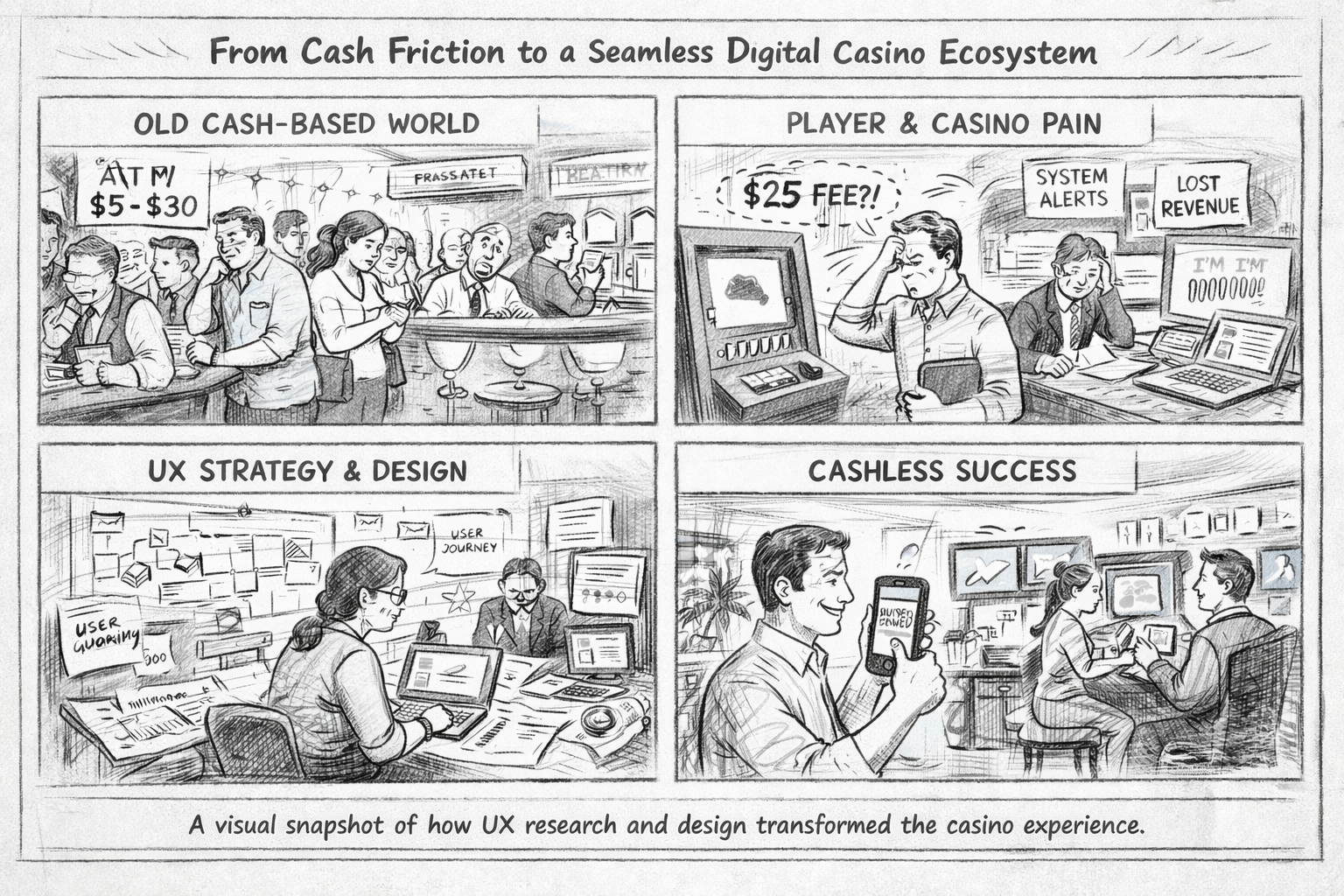 I led UX research, strategy, and product design across a multi-platform cashless casino ecosystem, collaborating closely with product, engineering, marketing research, compliance, and casino partners.